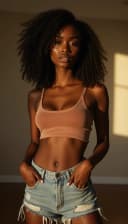 "black woman in casual clothing with warm lighting"