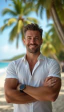 "white man working on laptop tropical beach environment"
