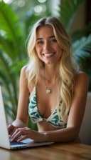 "white woman working on a laptop in a tropical setting"