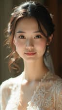 "asian woman wearing a bridal gown softly lit with a gentle ambiance"
