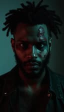 "black man with a zombie theme eerie lighting and a haunting atmosphere"