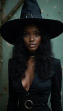 "black woman in a witch costume with moody lighting and a spooky vibe"
